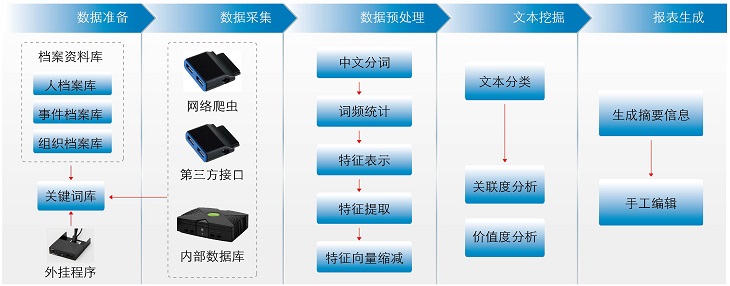 形成一套適合用于公安隊(duì)伍的可行的情報(bào)挖掘甄別輔助系統(tǒng),可高效地管理來(lái)自網(wǎng)絡(luò)及內(nèi)部數(shù)據(jù)庫(kù)的輿情信息,監(jiān)控重大事件輿情,發(fā)現(xiàn)危害輿情信息,并自動(dòng)對(duì)輿情信息進(jìn)行分類(lèi),有效提高信息化工作水平??傮w流程如下圖: